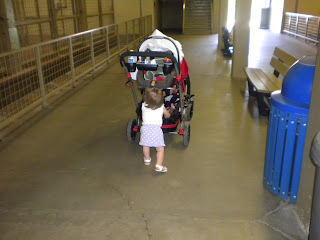 So first we go past the monkeys...all asleep. No funny monkeys. Then we went by the elephants. The baby elephant was moping around, but the mom was in the back corner with only her butt sticking out. (She was in the same position 3 hours later when we left the zoo). The rhinos were, well, rhino-y, really not doing much. Then we went to the Leopard, tiger, and wolf area! Nothing. The tiger just laid there, the leopard was hiding in the shade, and the wolf was just hiding. Then we saw the giraffe. Well first, we went into their waiting pen inside because it was air conditioned. Merrilee pushed the stroller up and down the aisles. She got mad when we left. It was really funny.
